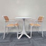 - Thiết kế tinh tế: Bộ bàn ghế bao gồm một bàn tròn đường kính 60cm và hai ghế nhựa đúc có tay vịn, tạo cảm giác thoải mái và chắc chắn cho người ngồi. Thiết kế nhỏ gọn, hiện đại giúp tiết kiệm diện tích, dễ dàng di chuyển và sắp xếp.