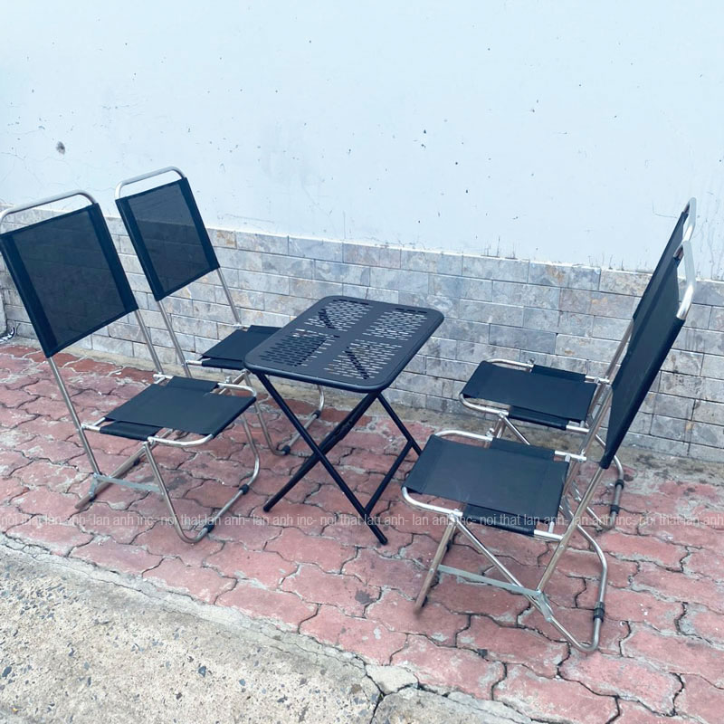 Bộ bàn ghế cafe xếp ngoài trời mini 1 bàn 4 ghế xếp Inox vải lưới lưng cao. Sản phẩm được dùng cho không gian ngoài trời như quán cafe, nhà hàng, sân vườn. Hãy cùng Nội Thất Lan Anh tìm hiểu chi tiết nhé!